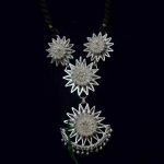 The two most common types of necklaces are madhumati and floral. The madhumati necklaces are in silver without any filigree work. The floral necklaces have a floral theme and are made of filigree work.